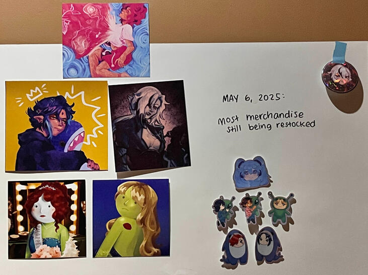 UPDATE 05/06/25: Most merchandise are still being restocked. Displayed below are prints, 2.28" buttons, and stickers.